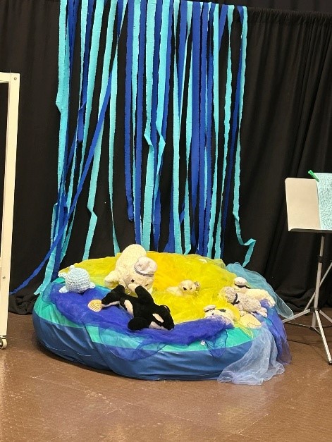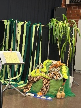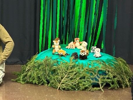 Wir wurden in die Aula eingeladen. Es war eine schöne Bühne aufgebaut. Die M4 erzählte die Geschichte über Alexia.